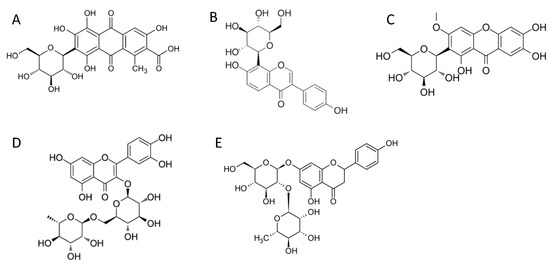 Structure of C- and O-glycosides used as substrates by ScPOx. (A) carminic acid; (B) puerarin; (C) mangiferin; (D) rutin and (E), naringin.