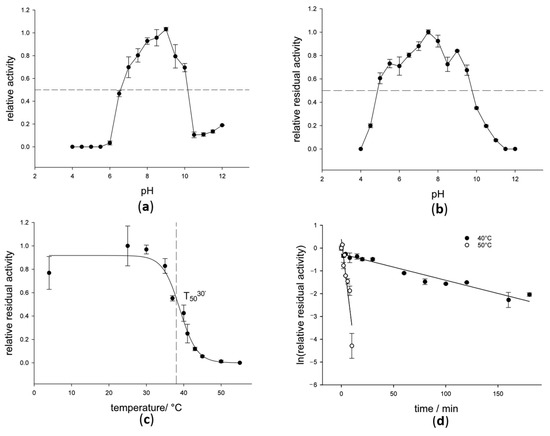 Enzyme stability explored with different approaches: (a) pH optimum profile for ScPOx at 30 °C. Areas in the plot that have more than 50% activity retained are indicated with a dashed horizontal line; (b) pH stability profile for ScPOx at 30 °C. Area in the plot that has more than 50% of activity retained is indicated with a dashed horizontal line; (c) T5030’ profile for ScPOx in 50 mM potassium phosphate buffer, pH = 6.5 and (d) half-life times at 40 and 50 °C in 50 mM potassium phosphate buffer, pH = 6.5. Measurements were done in triplicates and the mean value ± standard deviations are shown.