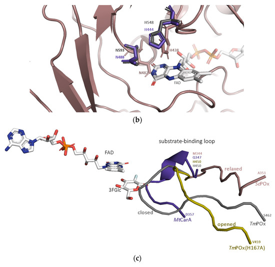 The catalytic His-Asn pair is well preserved in all POx sequences (Supplementary Materials Figure S3). This pair is formed by H438 and N482 in the ScPOx active site. While the structural model shows a good agreement with the positioning of the His residue with the corresponding residues from TmPOx and MtCarA, (H548 and H444, respectively), N482 shows a different conformation, namely a rotation by 95.7° compared to N593 and N488 from TmPOx and MtCarA, respectively (Figure 5b). The active-site loop 450HRDAFSYGAVQQ461 of TmPOx was reported to form a gate to the active site and thus plays an important role in substrate binding [15]. This loop is highly dynamic in TmPOx and was found to be a switch between a closed (PDB 1TT0) and an open conformation (PDB 2IGO) upon interaction with a monosaccharide substrate [16]. A comparison of the conformation of the corresponding substrate-binding loop of the ScPOx model (M344-P355) with the open and closed conformation of the TmPOx loop shows that it is in a more relaxed conformation, restricting the access to the active site less than the loop in TmPOx (Figure 5c). This might also explain the differences in the reactivities and substrate range of ScPO and TmPOx. Furthermore, the error estimates for the residues in the active-site loop (Supplementary Materials Figure S4) suggest a certain flexibility of the loop in ScPOx as well. The modelled position of this loop is also different from that of MtCarA. Docking of carminic acid into the active site of MtCarA showed that the aglycone of this substrate clashes with the active-site loop, hence a conformational rearrangement might be necessary for bacterial POxs as well to accommodate the bulky glycosides [13]. This will have to be answered by further structural studies, though.