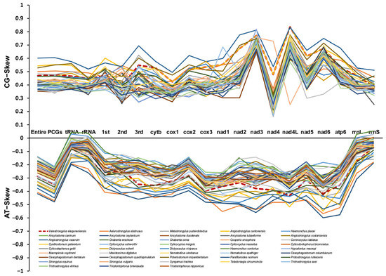 The nucleotide content of V. eleguneniensis mtDNA was 27.0% A, 48.8% T, 6.4% C, and 17.8% G, respectively, with a total of AT content of 75.9% (Table S1). This significant AT bias was similar to other Strongylida members and was within the range of AT contents described for other species in the same order (69.1 to 79.2%) [24,25]. And tRNAs and rRNAs also showed a strong AT bias with AT content of 79.17% and 78.16%, respectively. Generally, the AT and GC skews on the complementary strands of each mtDNA could be used to measure the compositional asymmetry [26]. For V. eleguneniensis mtDNA, the AT and GC skews were −0.287 and 0.471, respectively, and their comparisons with other 43 Strongylida species were shown in Figure 2. It was obvious that the nucleotide compositions of mtDNAs of these species consistently exhibited an extreme skew away from A and C in favor of T and G, with −0.48 to −0.145 of AT skew and 0.348 to 0.608 of GC skew. Specifically, the respective AT and GC skews were −0.198~0.043 and 0.368~0.577 in the rRNAs, −0.259~0.039 and 0.328~0.522 in the tRNAs, and −0.480~−0.004 and 0.337~0.608 in the concatenated 12 PCGs. Notably, among the PCGs, the TG bias was also significant at the first, second, and third positions of codons with AT and GC skews being −0.408~−0.099 and 0.363~0.603, −0.421~−0.122 and 0.260~0.548, and −0.459~−0.148 and 0.273~0.696, respectively.