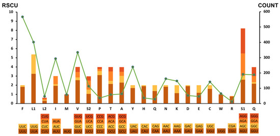 Relative synonymous codon usage (RSCU) and codon numbers in V. eleguneniensis mtDNA. Codon families are provided on the X-axis, and the RSCU of each codon is represented by different color bars (left axis scale). The codon numbers are indicated by the green line graph (right axis scale).