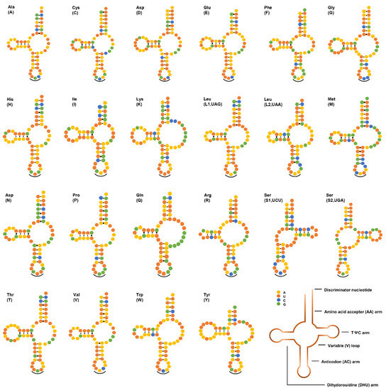 - Lowe, T.M.; Chan, P.P. tRNAscan-SE on-line: Search and contextual analysis of transfer RNA genes. Nucleic Acids Res. 2016, 44, W54–W57. [Google Scholar] [CrossRef]
