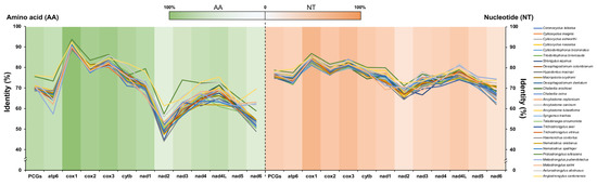 Identity comparison of PCGs for 28 related Strongylida species with V. eleguneniensis. Different species are indicated by different colored broken lines. The heat maps in green and orange represent the average values of sequence identities of amino acid and nucleotide datasets, respectively.