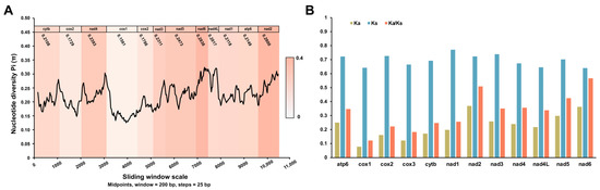 Evolutionary diversity analyses of the mtDNA among 40 Strongylida species including V. eleguneniensis. (A), Sliding window analyses of 12 PCGs. The black line shows the value of nucleotide diversity (Pi) in a sliding window analysis (200-bp sliding window with 25-bp step size); the Pi values of each gene are shown under the gene name and reflected by the heat maps on the background; (B), The evolutionary rates of 12 PCGs in Strongylida mtDNAs. The Ka, Ks, and Ka/Ks are calculated for each PCG.