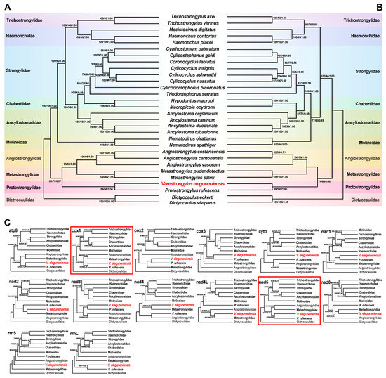 Phylogenies were inferred using three methods (MP, ML, and BI) based on mtDNA datasets containing 12 PCGs and two rRNAs. Dictyocaulus eckerti and Dictyocaulus viviparus are used as the outgroups. Different colored regions represent different families. (A), Phylogenetic tree based on the concatenated nucleotide sequences of the 12 PCGs; (B), Phylogenetic tree based on the concatenated amino acid sequences of the 12 PCGs; (C), Phylogenetic trees based on nucleotide sequences of 14 individual genes (12 PCGs and two rRNAs). The phylogenetic trees consistent with the trees in (A,B) are marked with red line boxes. The species sequenced in this study is shown in red fonts. The numbers along the branches indicate bootstrap values/posterior probabilities resulting from different analyses in the order MP/ML/BI.