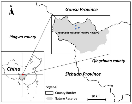 Sampling plots of takin lungworms collected from Tangjiahe National Nature Reserve, China. The red and blue dots on the map are the location of the Tangjiahe National Nature Reserve and the sampling points, respectively.