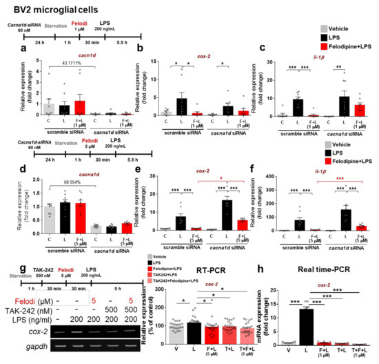 The dependence of the effects of felodipine or nitrendipine on LPS-evoked inflammatory responses on L-type Ca2+ channels was assessed by knocking down the L-type Ca2+ channel alpha subunit (cacna1d) in BV2 microglial cells. cacna1d or scramble (control) siRNA (Dharmacon, Rafayett, CO, USA) was diluted in Opti-MEM medium (Thermo Scientific, Waltham, MA, USA) and incubated with 1 µL of Lipofectamine® RNAiMAX reagent (Thermo Scientific, Waltham, MA, USA) for 30 min. The final siRNA concentration was 60 nM. The siRNA mixture was then added to cells (2.5 × 105 cells/well) in a 24-well cell culture plate. After 24 h, 1 or 5 μM L-type CCB or 1% DMSO (vehicle) was added, and 30 min later, 200 ng/mL LPS or PBS was added. Finally, real-time PCR was performed 6 h after L-type CCB or vehicle addition to measure the mRNA levels of cacna1d and the proinflammatory cytokines cox-2 and il-1β.