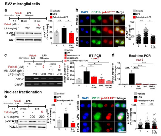 Felodipine inhibits LPS-stimulated AKT and STAT3 phosphorylation in BV2 microglial cells. (a) Western blot analysis of AKT phosphorylation in cells treated with 5 μM felodipine or vehicle (1% DMSO) for 45 min, followed by LPS (200 ng/mL) or PBS for 45 min (n = 6/group). (b) Immunocytochemical staining of p-AKTS473 in cells treated with 5 μM felodipine or vehicle (1% DMSO) for 45 min, followed by LPS (200 ng/mL) or PBS for 45 min (Veh, n = 443; LPS, n = 578; LPS+Felodi, n = 918). (c,d) Expression of the proinflammatory cytokine cox-2 in cells treated as shown with an AKT inhibitor (MK-2206), 5 μM felodipine, and LPS and analyzed via RT-PCR (c, n = 4/group) or real-time PCR (d, n = 8/group). (e) Nuclear fractionation and Western blotting analysis of LPS-mediated nuclear p-STAT3S727 levels in cells treated with 5 μM felodipine or vehicle (1% DMSO) for 30 min, followed by LPS (200 ng/mL) or PBS for 5.5 h (n = 6/group). (f) Immunocytochemical staining analysis of LPS-induced nuclear STAT3 phosphorylation in cells treated with 5 μM felodipine or vehicle (1% DMSO) for 30 min, followed by LPS (200 ng/mL) or PBS for 5.5 h (Veh, n = 414; LPS, n = 326; Felodi+LPS, n = 308). * p < 0.05, ** p < 0.01, *** p < 0.001, scale bar: 20 μm. V: vehicle; L: LPS; F or Felodi: felodipine, M: MK-2206.
