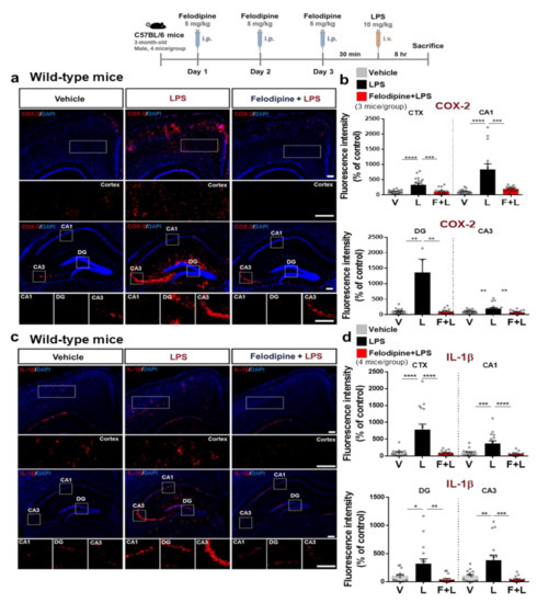 Since felodipine reduced LPS-stimulated microgliosis in the brain as shown in Figure 4, we examined whether felodipine alters LPS-induced proinflammatory cytokine levels in vivo. C57BL/6 mice were injected with felodipine (5 mg/kg, i.p.) or vehicle (5% Tween-20+ 5% PEG300 in saline) daily for 3 days, followed by LPS (10 mg/kg) or PBS on day 3 as described above, and immunofluorescence staining of brain sections was performed with anti-COX-2 or anti-IL-1β antibodies. Interestingly, daily felodipine administration for 3 days significantly reduced LPS-mediated COX-2 and IL-1β levels in the cortex and hippocampus in C57BL/6 mice (Figure 5a–d). These results indicate that daily treatment with felodipine for 3 days inhibits LPS-stimulated proinflammatory cytokine COX-2 and IL-1β levels in the brain, which may contribute to the effects of felodipine on LPS-stimulated microgliosis.