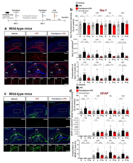 Although 3 days of daily i.p. injection of felodipine significantly reduced LPS-stimulated microgliosis in the cortex, LPS-induced microgliosis in the hippocampus was only slightly suppressed (Figure 4). To further determine whether longer treatment with felodipine differentially affects LPS-induced gliosis in vivo, C57BL/6 mice were injected with felodipine (5 mg/kg, i.p.) or vehicle (5% Tween-20 + 5% PEG300 in saline) daily for 7 days. On the 7th day, LPS (10 mg/kg) or PBS was intraperitoneally (i.p.) injected after the last felodipine administration. The mice were sacrificed 8 h after the LPS or PBS injection, and anti-Iba-1 and anti-GFAP antibodies were used for immunofluorescence staining of the brain sections. Importantly, daily administration of felodipine for 7 consecutive days significantly attenuated the Iba-1 fluorescence intensity in the cortex and hippocampal CA1 and DG regions (Figure 6a,b).