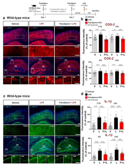 To investigate whether a longer period of felodipine treatment modulates LPS-mediated proinflammatory cytokine levels, 3-month-old C57BL/6 mice were injected daily with felodipine (5 mg/kg, i.p.) or vehicle (5% Tween-20 + 5% PEG300 in saline) for 7 days, followed by injection of LPS (10 mg/kg, i.p.) or PBS on day 7, 30 min after the last felodipine injection. Immunostaining of brain sections with anti-COX-2 and anti-IL-1β antibodies showed that treatment with felodipine daily for 7 days significantly suppressed the LPS-mediated elevation of COX-2 and IL-1β fluorescence intensity in the cortex and hippocampus (Figure 7a–d). These results suggest that longer felodipine treatment diminishes LPS-evoked proinflammatory cytokine COX-2 and IL-1β levels in C57BL/6 mice.