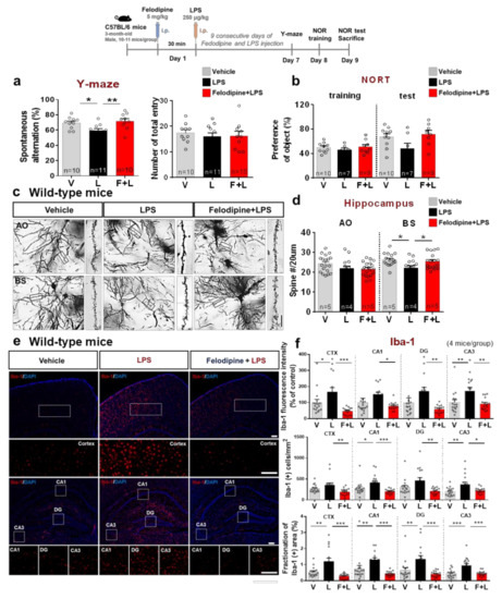 Treatment with felodipine daily for 9 days modulates LPS-induced short-term working memory impairment, hippocampal dendritic spine loss, and microgliosis in C57BL/6 mice. Three-month-old C57BL/6 mice were injected daily with vehicle (5% Tween-20 + 5% PEG300 in saline) or felodipine (5 mg/kg, i.p.), followed 30 min later by 250 μg/kg LPS or PBS for 9 days. (a) Y-maze tests were performed on day 7; spontaneous alternations and the number of total entries are shown (vehicle, n = 10 mice; LPS, n = 11 mice; felodipine+LPS, n = 10 mice). (b) Novel object recognition (NOR) training/tests were performed on days 8 and 9; object preference is shown (vehicle, n = 10 mice; LPS, n = 7 mice; felodipine+LPS, n = 9 mice). (c) Golgi staining was performed after the behavior experiments to measure dendritic spine number in the hippocampal AO and BS dendrites. (d) Quantification of data from (c) (vehicle, n = 19 slices from 5 mice; LPS, n = 15 slices from 4 mice; felodipine+LPS, n = 20 slices from 5 mice. (e) Microgliosis was assessed via immunofluorescence staining of Iba-1 in brain slices from the C57BL/6 mice used in the behavioral experiments. (f) Quantification of data from (e) (n = 4 mice/group, n = 16 brain slices). * p < 0.05, ** p < 0.01, *** p < 0.001. Golgi staining scale bar = 5 μM. IF scale bar = 100 μM. V: vehicle; L: LPS; F or Felodi: felodipine.