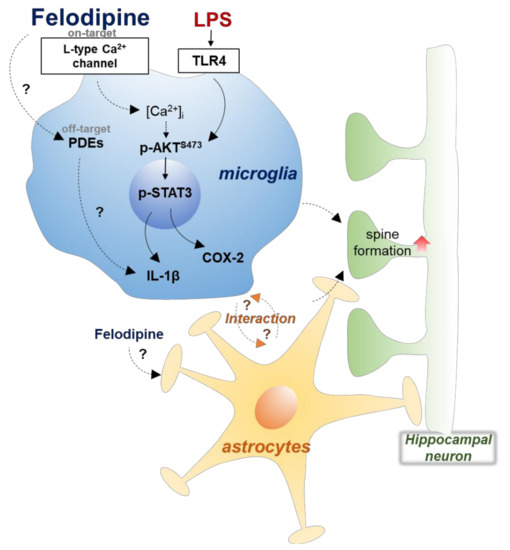 Various neurological diseases, including neurodegenerative diseases, are accompanied by neuroinflammation. Therefore, the regulation of microglia, which play a pivotal role in neuroinflammation, has been regarded as a therapeutic target [18,19,20]. In this study, we demonstrated that the L-type CCB felodipine significantly suppressed LPS-induced proinflammatory cytokine release via L-type Ca2+ channel/TLR4/AKT signaling pathways in BV2 microglial cells. In addition, felodipine inhibited LPS-stimulated nuclear STAT3 activation in vitro. In in vivo experiments, felodipine administration daily for 7 days reduced LPS-evoked gliosis in the brain more effectively than felodipine administration daily for 3 days, although both treatments reduced proinflammatory cytokine levels. Moreover, felodipine restored chronic LPS-mediated impairment of short-term spatial memory by promoting hippocampal dendritic spine formation (Figure 9). These results may support the repurposing of the L-type CCB felodipine for the treatment of neuroinflammation and impaired cognitive function.