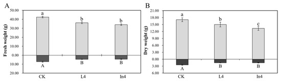 Changes in shoot and root biomass in P. koraiensis under different supplementary lights. (A) Fresh weight. (B) Dry weight. CK: Control. L4: Supplementary LED for 4 h. In4: Supplementary incandescent lamp for 4 h. Letters of a, b, and c are labels for the shoots, and A and B are labels for the roots.