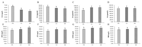 The concentrations of auxin (IAA), gibberellin (GA), ethylene (ETH), abscisic acid (ABA), jasmonic acid (JA), salicylic acid (SA), brassinosteroid (Br), and zeatin (ZT) were significantly differentially expressed (p < 0.01) in all treatments (Supplementary Table S1). In addition, IAA and GA concentrations of the CK were significantly higher than in the two supplementary light treatments (Figure 2A,B). On the other hand, the levels of ETH, ABA, JA, SA, Br, and ZT in the CK treatment were significantly lower than those in the supplementary light treatments (Figure 2C–H). Furthermore, the IAA concentration of In4 treatment had the lowest level among all treatments, but ABA and Br were significantly higher under the In4 treatment than those in the other treatments. In the L4 treatment, the contents of JA, SA, ZT, and ETH were the highest among all treatments.