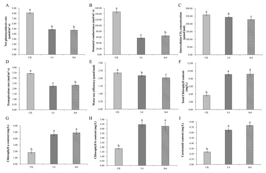 For photosynthesis analysis, all photosynthetic parameters showed significant differences (p < 0.01) in all treatments (Supplementary Table S1). As shown in Figure 3A–E, all supplementary light treatments induced a significant decrease in the net photosynthetic rate (Pn), stomatal conductance (Gs), intercellular CO2 concentration (Ci), transpiration rate (Tr), and water use efficiency (WUE) compared with the CK treatment. Gs and Tr in L4 were significantly lower than those of the other treatments. Furthermore, Ci and WUE in In4 were the lowest among all treatments.