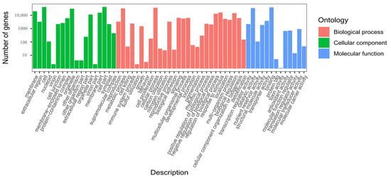 PCA was performed by using the unsupervised pattern recognition method. The numbers of mapped reads and transcript lengths were normalized in the samples. Then, the gene expression level was measured by FPKM (Fragments Per Kilobase of transcript per Million fragments mapped). Differential expression analysis was conducted with DEseq2 [61,62]. The DEGs were identified according to |log2 Fold Change| ≥ 1 and p-value < 0.5. For DEGs’ analysis, the GOseq R package was used in GO functional annotation, and KOBAS software was used in the enriched pathways’ analysis of KEGG.
