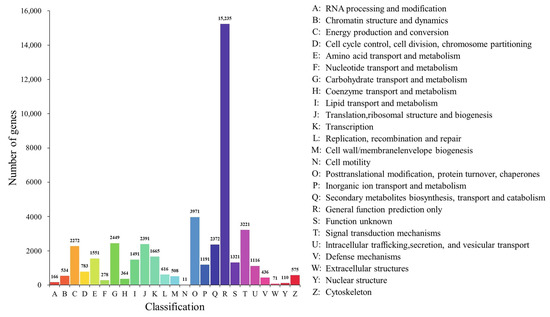 Gene function annotation was carried out, and the unigene sequences were mapped to public databases by using DIAMOND [32] BLASTX, with the following results. A total of 79,318 (46.76%) unigenes matched to a sequence in at least one of the following databases. The number of unigenes was 75,329 (44.41%) in the Nr (nonredundant protein sequences) database, followed by 74,197 in the TrEMBL (43.74%), 63,525 in the GO (Gene Ontology) (37.45%), 51,949 in the KEGG (Koyoto Encyclopedia of Genes and Genomes) (30.63%), 51,020 in the Swiss-Prot (a manually annotated and reviewed protein sequence database) (30.08%), 50,187 in the Pfam (Protein family) (29.59%), and 41,321 in the KOG (eukaryotic Orthologous Groups) (24.36%) databases. According to a search on the GO database, a total of 59 terms were concentrated: the number of ‘biological process’ was the largest, which was 28, followed by 18 in the ‘cellular component’ and 13 in the ‘molecular function’ (Figure 4) (Supplementary Table S4). By alignment of unigene sequences with the Nr database, the unigene sequences had the strongest matches with the gene sequences from Picea sitchensis (38.85%), followed by Quercus suber (6.72%), Amborella trichopoda (5.45%), Nelumbo nucifera (2.99%), Picea glauca (2.97%), Pinus taeda (2.49%), Pinus tabuliformis (1.78%), Macleaya cordata (1.45%), Marchantia polymorpha subsp. ruderalis (1.35%), Physcomitrella patens (1.32%), Vitis vinifera (1.32%), and Pinus radiata (0.99%) (Figure 5). The unigene sequences matched to the KOG database according to the sequence similarity, and the results showed that the top three classes were: (R) ‘general function prediction only,’ (O) ‘post-translational modification, protein turnover, chaperones,’ and (T) ‘signal transduction mechanisms’ (Figure 6).