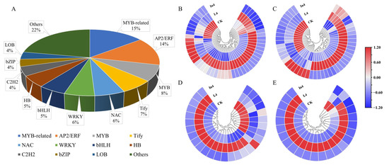 Changes in relative expression levels of DEGs encoding transcription factors in P. koraiensis under different supplementary lights. (A) The percentage of transcription factor families in all comparison groups. Heatmaps of DEGs involved in (B) MYB-related, (C) AP2/ERF, (D) MYB, and (E) Tify transcription factor families. CK: Control. L4: Supplementary LED for 4 h. In4: Supplementary incandescent lamp for 4 h. The color scale from blue to red indicates the expression value from low to high.
