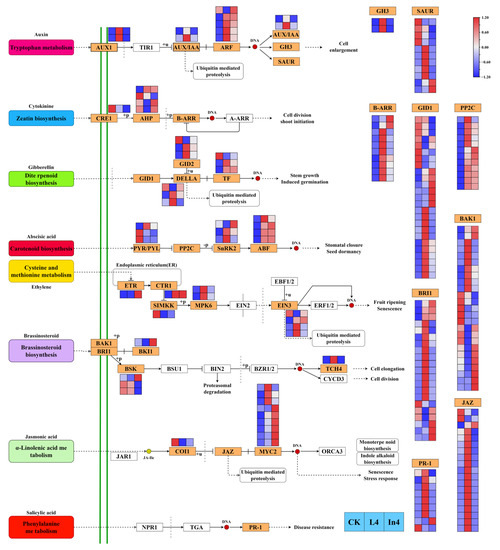 Analysis of DEGs related to phytohormone signaling pathways. The gene expression levels in the three samples are shown in different columns in the colored boxes, and different rows represent different genes. CK: Control. L4: Supplementary LED for 4 h. In4: Supplementary Incandescent lamp for 4 h. The color scale from Min (blue) to Max (red) refers to the expression value from low to high.