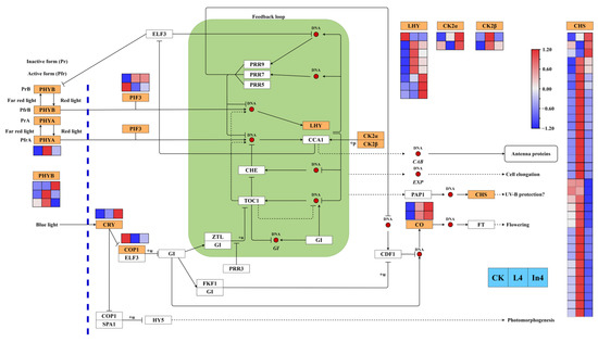 From the results of KEGG enriched pathways in this study, it can be seen that circadian rhythm-plant was one of the top 20 enriched pathways in all comparison groups. There were 53 genes encoding 10 enzymes that were significantly differentially expressed in different treatments (Figure 10) (Supplementary Table S11). In the two supplementary light treatments, PHYA, CRY, and CO genes were upregulated and the COP1 gene was downregulated. The majority of PHYB genes were also upregulated in the two supplementary light treatments. All DEGs encoding LHY (except Cluster-27241.45170) were upregulated in the two supplementary light treatments compared with the CK. All CK2α DEGs were upregulated in In4, and all CK2β DEGs were upregulated in L4. Meanwhile, most genes encoding CHS were upregulated in L4, and were downregulated in In4.