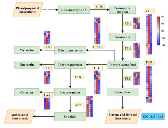 There was a total of 107 genes encoding 9 enzymes in flavonoid biosynthesis (Figure 11) (Supplementary Table S12). The majority of CHS DEGs were upregulated in L4, and downregulated in In4, however, only Cluster-27241.71072 showed the opposite trend. Interestingly, the results of the expression levels of F3H, FLS, F3′5′H, F3′H, and DFR showed that they had similar trends to CHS. However, most DEGs encoding ANS were downregulated in In4. In addition, all LAR genes were upregulated in L4.