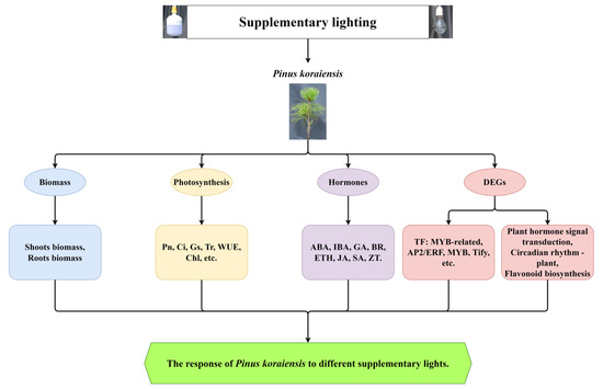A proposed model of the response of P. koraiensis under different supplementary lighting. The model suggested that the biomass, photosynthetic parameters, hormones, TFs, and several metabolic pathways were altered under different supplementary treatments. They all played a role in the response to supplemental lighting.