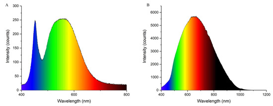 Spectral qualities of the supplementary light sources. (A) White LEDs (L) and (B) incandescent lamp (In).