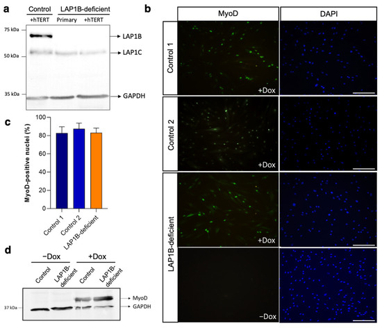 To establish a human in vitro model of LAP1B-associated muscular dystrophy, we immortalized primary fibroblast cells derived from two healthy individuals and patient-derived fibroblasts carrying a biallelic LAP1B-specific loss-of-function mutation (c.186delG) in TOR1AIP1 [17] (Figure 1a), and transduced them with a doxycycline-inducible MYOD1 for myoconversion [32]. Similar transduction efficiencies (>83%) were achieved between the control and LAP1B-deficient cells, as shown by the quantification of MyoD-positive nuclei after doxycycline supplementation (Figure 1b,c). No illegitimate MyoD expression was detected in the fibroblasts incubated in a differentiation medium without doxycycline supplementation (Figure 1b,d).