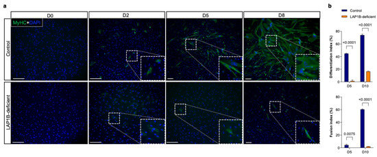 Myogenic differentiation of the control and patient-derived LAP1B-deficient fibroblasts. (a) Immunofluorescence staining of MyHC in the control and LAP1B-deficient cells at day 0 (D0), day 2 (D2), day 5 (D5), and day 8 (D8) after MyoD induction. The nuclei are stained with DAPI. The insets show MyHC-positive cells. Scale bar: 20 μm. (b) Fusion index (percentage of nuclei in MyHC-positive cells with at least two nuclei relative to the total number of nuclei) and differentiation index (percentage of nuclei in MyHC-positive cells relative to the total number of nuclei) in the control and LAP1B-deficient cells at day 5 (D5) and day 10 (D10) of differentiation. n = 3, where n represents the number of independent experiments, and p-values were determined using a two-way ANOVA followed by Bonferroni post hoc tests.