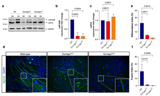To study the effect of the loss of LAP1B in myoblast cells, two mutant C2C12 murine myoblast lines were created using CRISPR-Cas9 genome editing. In mice, LAP1A and LAP1B are expressed from a common transcription start site, and LAP1C is transcribed from a downstream alternative transcription start site [6,12]. Two mutant C2C12 myoblast clones harboring loss-of-function mutations in the first coding exon for LAP1A/B in Tor1aip1 (Tor1aip1cl1 and Tor1aip1cl2) were created (Figure S2). Significant downregulation of LAP1A/B was achieved in the Tor1aip1cl1 and Tor1aip1cl2 compared to the wild type (7.7-fold and 8-fold decrease, respectively), with no significant difference in LAP1C expression (Figure 3a–c). As previously reported in other studies, we found that LAP1C was the predominantly expressed isoform in the proliferating wild-type myoblasts and, upon induction of differentiation, LAP1A/B expression increased, supporting their critical role during the differentiation process (Figure 3a) [24]. Myogenic differentiation and fusion potentials of the wild-type and Tor1aip1-mutant myoblasts were monitored for five days through MyHC expression (Figure 3d). Both differentiation and fusion indices significantly decreased in the mutant clones compared to the wild-type cells (Figure 3e,f). In conclusion, loss of LAP1A/B alone was sufficient to impair myogenic differentiation and fusion in both myoconverted human fibroblasts and C2C12 murine myoblasts.