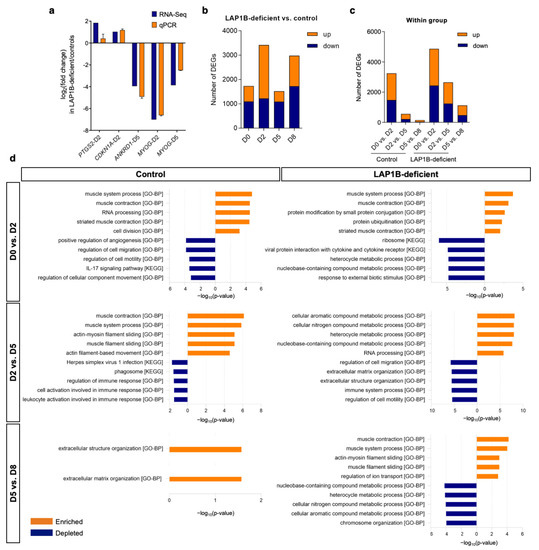 The ontrol and LAP1B-deficient immortalized MyoD-converted fibroblasts were seeded as triplicates on three independent culture plates, and differentiation was induced as described above. Total RNA was extracted from one million cells at day 0, day 2, day 5, and day 8 after induction of differentiation using the Hybrid-R total RNA isolation kit (GeneAll Biotechnology, Seoul, Korea), according to the manufacturer’s instructions. Total mRNA libraries for 36 samples were constructed using the SENSE mRNA-seq Library Prep Kit for Ion Torrent (Lexogen GmbH, Vienna, Austria), and sequencing was performed using the Ion S5 System (Ion Torrent, Thermo Fisher Scientific, Waltham, MA, USA) by the Hacettepe University Advanced Technologies Application and Research Center. Quality control of the raw data was performed using FastQC (V0.11.5), and adaptor sequences were removed and reads were trimmed using Cutadapt (V1.18) [52,53]. Reads were mapped to the human reference transcriptome GRCh38 using Salmon (V0.8.1), compensating for GC and sequence-specific biases, and gene abundance was calculated from the read counts per transcript using the tximport package [54,55], based on Ensembl release 86 [56]. After normalization and comparison with a distance matrix, three outliers (samples 6, 21, and 32) were removed. Differential expression was calculated using DESeq2 (V1.20) [57]. The two control samples were averaged and combined as a single control group, and compared to the LAP1B-deficient sample group. For statistical significance, the likelihood-ratio test was applied with the Benjamini–Hochberg False Discovery Rate for multiple comparison correction where q-values represent corrected p-values. Genes were considered to be significantly differentially expressed when the q-value was <0.05 and the linear expression fold change was ≥2. A generalized linear model was used as the regression model for the time-course analysis of differentially expressed genes (DEGs). In time-course analysis, expression of genes at each day was compared to day 0, allowing the comparison of genes that were consistently downregulated or upregulated throughout differentiation between the controls and the mutant cells. For the regression analysis, genes were considered to be significantly differentially expressed when the p-value was <0.05 and the linear expression fold change was ≥4.