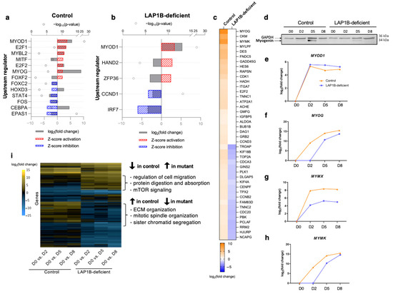 Upstream regulator and time-course regression analyses. (a,b) Upstream transcription regulators were predicted to be affected in the (a) control and (b) LAP1B-deficient cells during the transition from day 0 to day 2 of differentiation using Ingenuity Pathway Analysis. The upper X-axis shows −log10 of p-values (circles) for each upstream regulator. The lower X-axis shows log2 of expression fold changes (grey bars) and predicted transcriptional activation Z-scores (dashed red bars show activation, i.e., z-score > 2; dashed blue bars show inhibition, i.e., z-score < −2). (c) Heat map showing expression fold changes of DEGs in the MyoD network during the day 0–day 2 transition in the control and LAP1B-deficient cells. Genes that are upregulated in the controls, and downregulated or unchanged in the LAP1B-deficient cells are displayed. (d) Protein expression of myogenin in the control and LAP1B-deficient cells at days 0, 2, 5, and 8 of differentiation; GAPDH was used as a loading control. (e–h) RNA expression fold changes of (e) MYOD1, (f) MYOG, (g) MYMX, and (h) MYMK throughout differentiation as determined using RNA-Seq. (i) Clustered heat map showing expression fold changes of DEGs identified using time-course regression analysis. The top three enriched GO and KEGG categories for DEGs with opposite expression trends in the control and LAP1B-deficient cells throughout differentiation are shown.