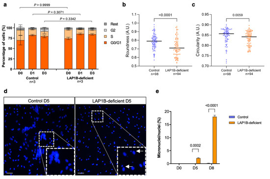 Cell cycle assay and nuclear morphologic and morphometric analyses. (a) Percentage of the control and LAP1B-deficient cells in the G0/G1, S, and G2 phases of the cell cycle, as assessed using propidium iodide staining and flow cytometry. n = 3, and p-values were determined using a two-way ANOVA followed by Bonferroni post hoc tests. (b) Roundness and (c) circularity of nuclei (A.U.; arbitrary unit) in the control and LAP1B-deficient immortalized fibroblasts. p-values were determined using the Mann–Whitney U test, and n represents the total number of nuclei evaluated in three independent experiments. (d) Micrographs of the control and LAP1B-deficient cells at day 5 of differentiation, which were stained using DAPI for nuclei. Arrows indicate the nuclei associated with the micronuclei. Scale bar: 20 μm. (e) Percentage of micronuclei relative to the total number of nuclei in the control and LAP1B-deficient cells at days 0, 5, and 8 of differentiation. n = 3, and p-values were determined using a two-way ANOVA followed by Bonferroni post hoc tests.