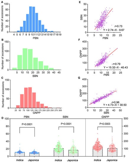 We surveyed three panicle traits (PBN, SBN, and GNPP) and found that they showed considerable variation in 468 accessions (Supplementary Materials Table S1). Specifically, the PBN ranged from 5.3 to 19.0, with an average of 10.7 (Figure 1A). The SBN varied from 3.0 to 55.0, with an average of 19.9 (Figure 1B). The GNPP fluctuated between 42.3 and 358.7, with an average of 125.1 (Figure 1C). In addition, all three panicle traits displayed an approximately normal distribution (Figure 1E–G). We further investigated these phenotypic differences between indica and japonica subpopulations because they are two major subspecies of Asian-cultivated rice and differ in more than 40 characteristics []. It showed significant differences in PBN, SBN, and GNPP between subpanels of indica and japonica (Figure 1D). The mean PBN, SBN, and GNPP in the indica subpanel were 11.2, 21.5, and 133.9, which are 12.96, 28.39 and 24.87% higher than those in the japonica subpopulation, respectively. To understand the relationship between these three traits, we performed a pairwise-correlation analysis among PBN, SBN, and GNPP using the Pearson method. The results showed strong positive correlations between PBN and SBN, GNPP, and between SBN and GNPP, with correlation coefficients (r) of 0.73, 0.79, and 0.96, respectively (Figure 1E–G). In conclusion, the PBN, SBN, and GNPP traits are adequate for subsequent GWAS analyses.
