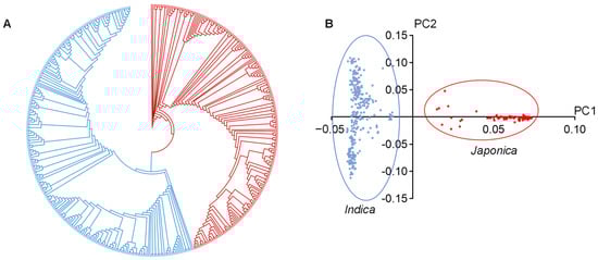 Population structure of 468 rice accessions. (A) Phylogenetic tree of 468 rice accessions. (B) Principal component analysis of 468 rice accessions. The first and second principal components are represented by PC1 and PC2, respectively. Blue and red colors correspond to indica and japonica accessions, respectively.
