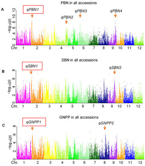 The rice panicle is relatively complex and consists of a rachis (main axis), primary branches directly attached to the rachis, secondary branches produced in primary branches, and spikelets in branches. GNPP is determined by the rate and duration of spikelet differentiation from a developmental perspective. In addition, morphologically, GNPP is directly influenced by the branch number as grains or spikelets are grown on branches []. Here, we investigated the PBN, SBN, and GNPP traits of 468 accessions and found a high positive correlation between them, with correlation coefficients of 0.79 between GNPP and PBN and 0.96 between GNPP and SBN (Figure 1E–G). Our study further supports that GNPP is directly affected by branching numbers, especially secondary branch numbers. The high positive correlation among PBN, SBN, and GNPP is also the reason for the similar GWAS results of these three traits, especially for SBN and GNPP (Figure 3, Supplementary Materials Figure S1).