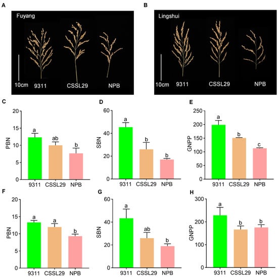 Validation of GWAS-associated qPSG1 by CSSL. (A) Panicles of 9311, CSSL29, and NPB in Fuyang, Zhejiang Province. (B) Panicles of 9311, CSSL29, and NPB in Lingshui, Hainan Province. (C–E) Comparison of PBN (C), SBN (D), and GNPP (E) among CSSL29, 9311, and NPB in Fuayng, respectively. (F–H) Comparison of PBN (F), SBN (G), and GNPP (H) among CSSL29, 9311, and NPB in Lingshui, respectively. Data in (C–H) represent mean ± SD from ten replicates. Different lowercase letters indicate significant differences based on Duncan’s new multiple range test (p < 0.05).