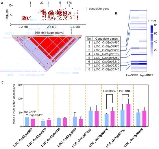 Expression levels of 57 genes in qPSG1. (A) Linkage disequilibrium plot for SNPs with −log10(p) value > 2.5 in qPSG1 on Chr. 2. (B) The expression levels of all 57 genes in the 360 kb linkage interval of qPSG1 in young panicles of ten high-GNPP and ten low-GNPP accessions from 468 rice accessions. (C) The expression levels of eight candidate genes in young panicles of ten high-GNPP and ten low-GNPP accessions from 468 rice accessions. Eight candidate genes with high expression are numbered from 1 to 8. The blue lines indicate the position of eight candidate genes with high expression levels. The light blue and pink bars indicate the gene expression in ten high-GNPP and ten low-GNPP accessions, respectively. Expression data represent mean FPKM values (n = 10). The p-value is obtained from the t-test.