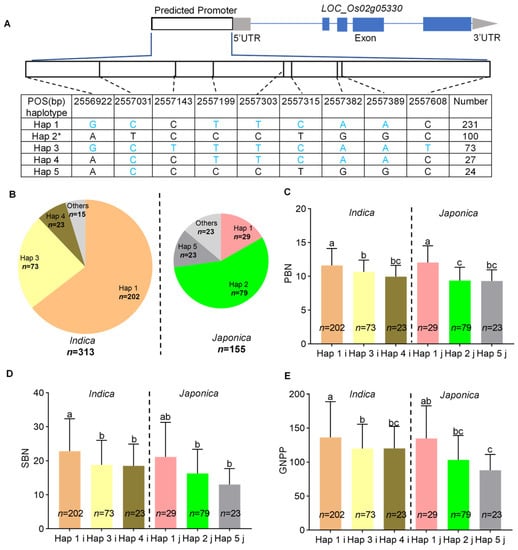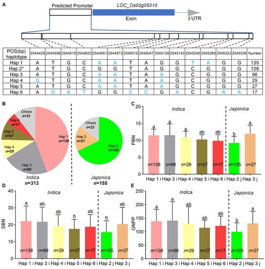 Haplotype analyses of LOC_Os02g05310. (A) Schematic representation of LOC_Os02g05310 structure and the positions of 14 SNPs used for haplotype analysis. SNPs that differ from the reference sequence are marked with blue letters. (B) The haplotype frequency distribution of LOC_Os02g05310 in the two subpanels, indica and japonica. Comparisons of (C) PBN, (D) SBN, and (E) GNPP among accessions with different haplotypes in the two subpanels, indica and japonica. * indicates the haplotype is the same as NPB. Others in the pie chart indicate haplotypes with a frequency of less than ten. The i and j behind Hap in (C–E) indicate indica and japonica accessions with relevant haplotypes, respectively. Different lowercase letters indicate significant differences among accessions with different haplotypes based on Duncan’s new multiple-range test (p < 0.05).