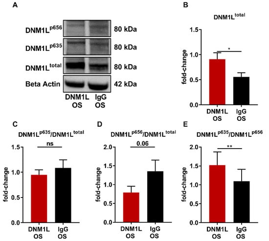 In contrast, the phosphorylation site DNM1Lp656/total expression level was considerably lower in the DNM1L OS group compared to the IgG OS (Figure 5D). Decreased DNM1Lp656 level might indicate increased mitochondrial fission [44]. Since the two phosphorylation sites synergistically regulate DNM1L activity, it is not sufficient to consider the expression level separately but to compare the ratios of both phosphorylation sites in combination (Figure 5E, DNM1Lp635/p656). This ratio was moderately but significantly increased in the DNM1L OS group compared with IgG OS, indicating increased mitochondrial fission.