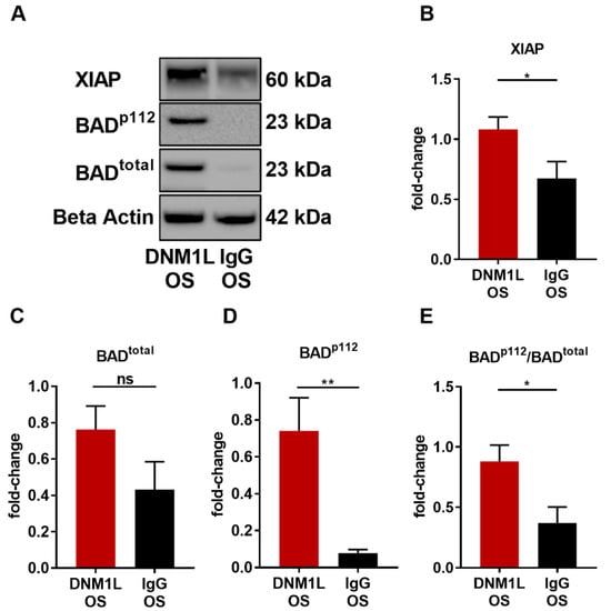 To determine the effect of anti-DNM1L Ab injection on apoptosis, the expression levels of X-linked inhibitor of apoptosis (XIAP) and Bcl-2 antagonist of cell death (BAD) were identified, and its phosphorylation site serine 112 (BADp112) was analyzed. XIAP expression was significantly increased in the DNM1L OS group (fold-change: 1.10 ± 0.12) compared with the IgG OS group (fold-change: 0.69 ± 0.15, p < 0.05, student’s-test). The BAD total protein fold-change in the DNM1L OS group was 0.76 ± 0.13, and in the IgG OS, 0.43 ± 0.15 (Figure 6B, BADtotal). However, the phosphorylation site BADp112 was 0.74 ± 0.18 in the DNM1L OS, and the IgG OS was 0.08 ± 0.02, which significantly decreased (Figure 6D, p < 0.05). The pBAD/BAD ratio (Figure 6E, BADp112/total) in the DNM1L OS group was 0.88 ± 0.13, and in the IgG OS group, it was 0.37 ± 0.13.