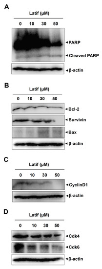 2.4. Latif Induces Apoptotic Caspase Cascade and Suppresses Cell Cycle Proteins in Human YD-10B OSCCs