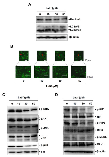 2.6. Latif Suppresses Autophagy- and Necroptosis-Regulating Proteins in Human YD-10B OSCCs