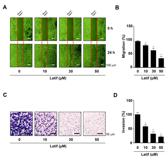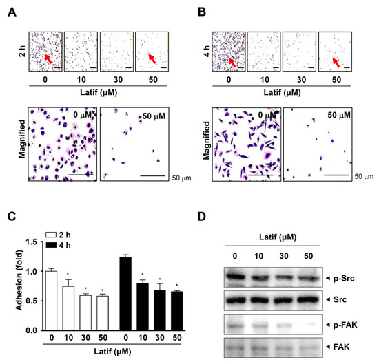 2.7. Latif Inhibits Cell Migration, Invasion, and Adhesion in Human YD-10B OSCCs