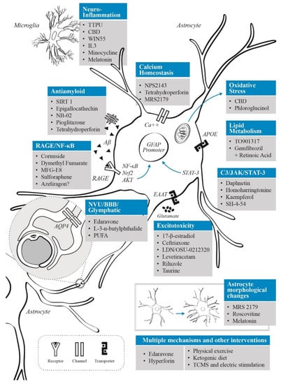 - Valenza, M.; Facchinetti, R.; Menegoni, G.; Steardo, L.; Scuderi, C. Alternative Targets to Fight Alzheimer’s Disease: Focus on Astrocytes. Biomolecules 2021, 11, 600. [Google Scholar] [CrossRef]