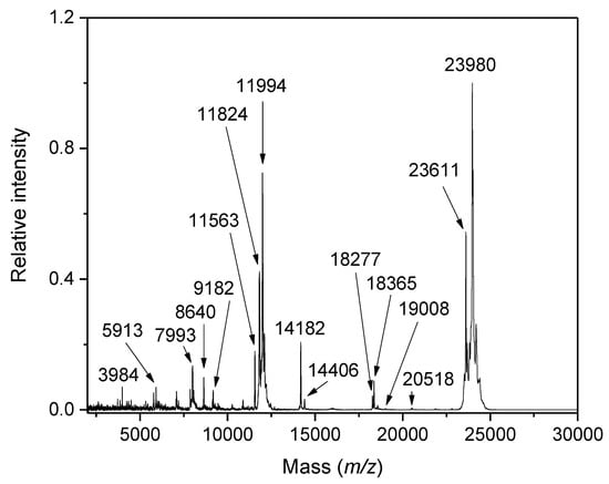 MALDI-TOF MS of milk. This sample of aseptically packed fresh milk was measured using an ultrafleXtreme instrument (Bruker Daltonics). The depicted spectrum was acquired in the linear positive ion mode with a stainless-steel target and sinapinic acid (SA) as a matrix according to Fanton et al. [27]. Many peptides were detected at masses below 6 kDa such as that at m/z 3984, which is a fragment of αS1-casein [28]. Major protein peaks refer to γ3-casein (m/z 11,563), γ2-casein (m/z 11,824), α-lactalbumin (m/z 14,182), β-lactoglobulin (m/z 18,277 and 18,365—two variants), κ-casein (m/z 19,008), γ1-casein (m/z 20,518), αS1-casein (m/z 23,611), and β-casein (m/z 23,980). The content is author´s own work.
