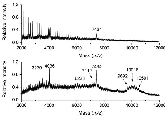 MALDI-TOF MS of beer. This sample of a non-pasteurized Czech lager beer was measured using an ultrafleXtreme instrument (Bruker Daltonics). The depicted mass spectra were acquired in the linear positive ion mode with a stainless-steel target and DHB as a matrix according to Šedo et al. [82]. The top panel shows a series of maltooligosacharides (m/z 2160–7365, sodium adduct peaks, with a regular mass difference of 162 units) and was acquired from the central part of the sample spot. The bottom spectrum shows signals of beer proteins. It was acquired from the rim of the sample spot. Interestingly, the signal cluster between m/z 9692 and 10,501 refers to the non-specific lipid transfer protein 1 (LTP1) from barley and its glycated forms [81]. The content is author´s own work.