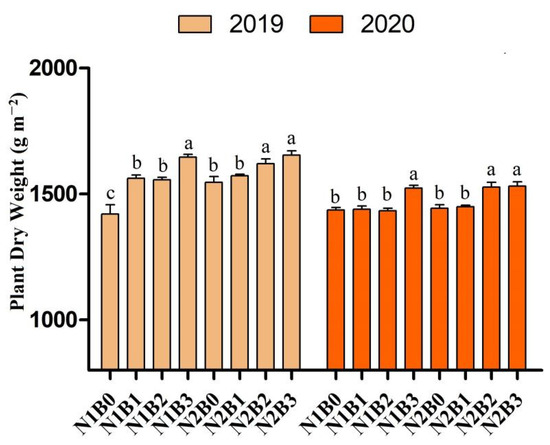 Results showed that all biochar-applied treatments resulted in higher plant dry weight than non-biochar-treated plots (Figure 1). Compared to sole N applied treatment(N1B0), the combined treatments N1B2, N1B3, N2B2, and N2B3 increased plant dry weight by 9%, 15%, 14%, and 16%, respectively, during 2019. Similarly, during 2020, an increase of 6%, 8%, and 9% were recorded in N1B3, N2B2, and N2B3 compared to control (N1B0).