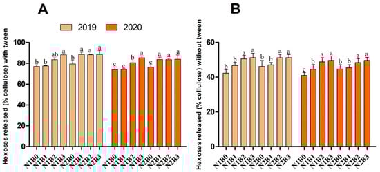 Biomass digestibility refers to the hexose yield (% cell cellulose) or total sugar (% dry matter) released during enzymatic hydrolysis from the pretreated biomass residues. In the current study, we used a mild alkali pretreatment (1% NaOH) without Tween-80, and with a co-supply of 1% Tween-80 on rice crops harvested from different biochar and nitrogen fertilizer applied treatments. Biochar, in combination with nitrogen fertilizer, significantly affected hexose yields (with and without Tween-80) during both years (Figure 2). Analysis of the results showed that biochar at the rate of 20 to 30 t ha−1 (N1B2, N1B3, N2B2, and N2B3) significantly improved hexoses yield (with Tween-80) by 8–15% (% cellulose) as compared to sole urea applied treatments during both years. Similarly, compared to control without Tween-80, hexose yield was higher by 18–21% in combined biochar and nitrogen fertilizer treatments. Notably, Tween-80 significantly enhanced the hexose yield in all nitrogen coupled with biochar supply.